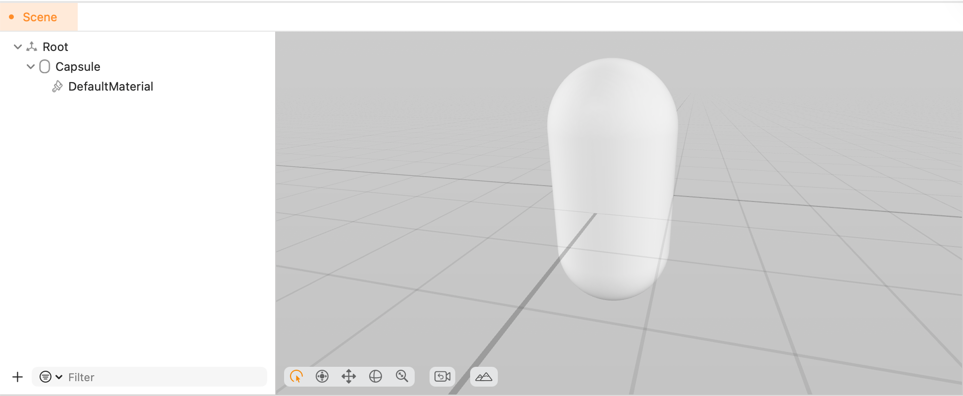 }From there, it's all about showing the scene hierarchy; for example, here's the result of adding a Primitive Shape > Capsule.