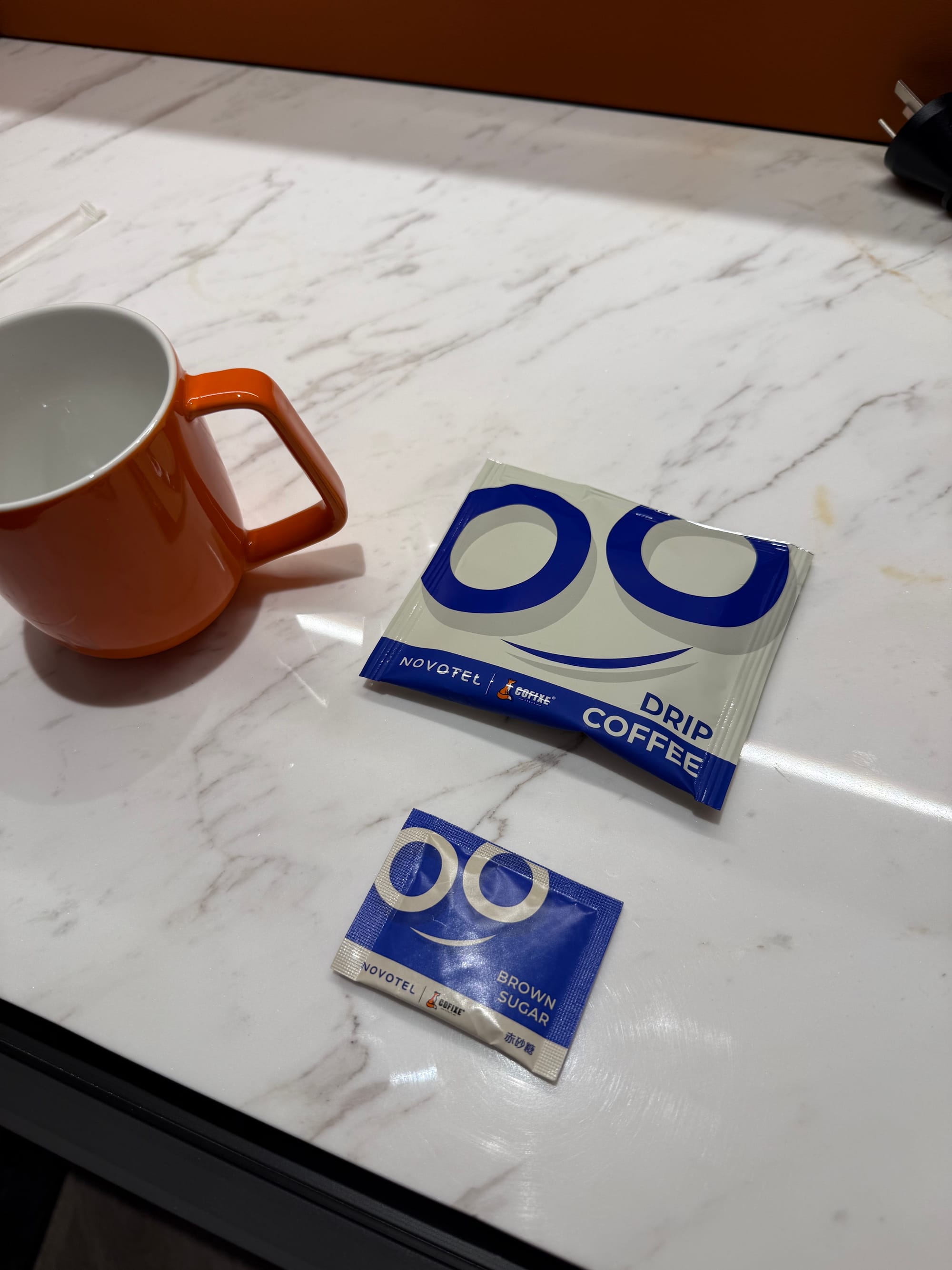 Photo sequence of the preparation of drip coffee available in the hotel room.