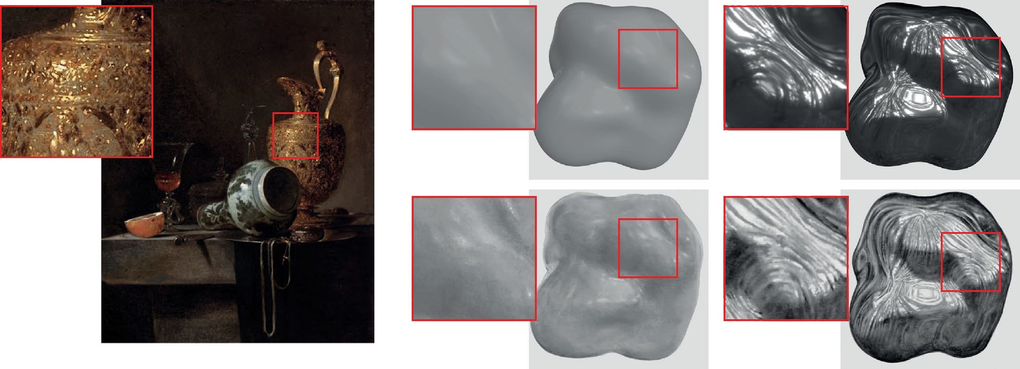 | Delanoy et al., 2021 | Both | Material appearance (contrast, highlights, glossiness) | Paintings vs. renderings, web-based 2D images | Material properties perceived similarly in both media; key image features drive perception |